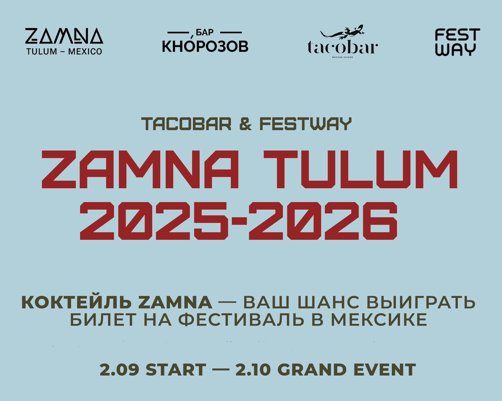Со 2 сентября по 2 октября в tacobar можно выпить коктейль, отсканировать QR-код — и выиграть мультипасс на крупнейший фестиваль электронной музыки ZAMNA TULUM, который пройдет в январе в Мексике.